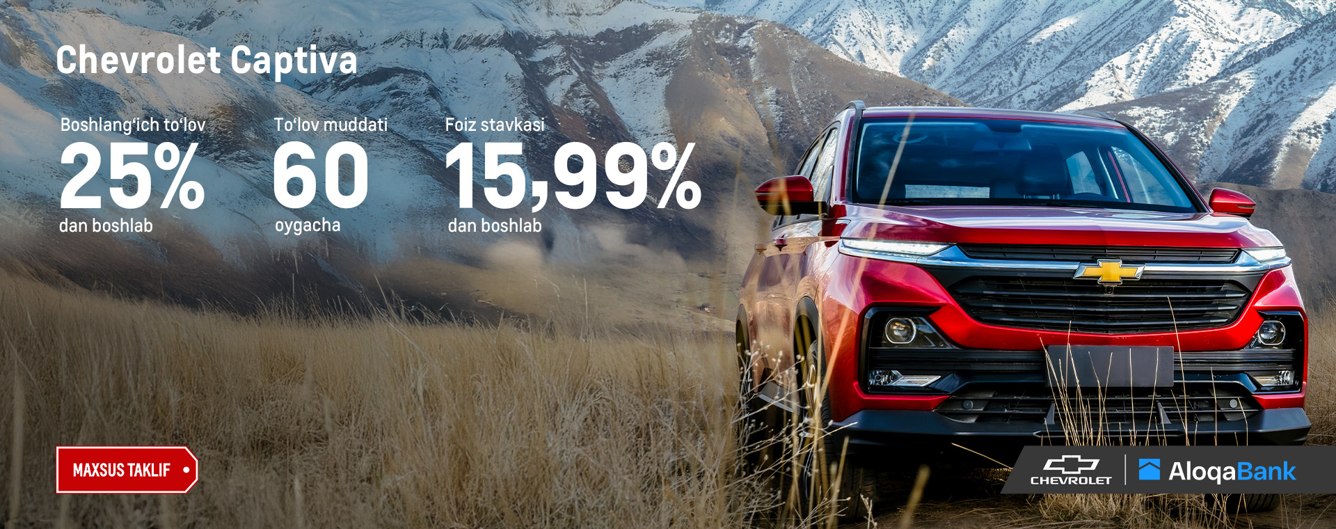 Chevrolet avtomobiliga ega bo‘lish uchun eng yaxshi vaqt! AloqaBank Chevrolet Onix*, Tracker*, Malibu, Traverse va Captiva avtomobillarini xarid qilishni istagan fuqarolar uchun qulay kredit tizimini taklif qiladi.