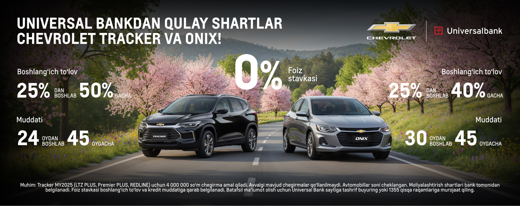 Maxsus hamkorlik dasturi doirasida Chevrolet Onix, Tracker, Damas va Labo avtomobillarini manfaatli shartlarda xarid qiling.