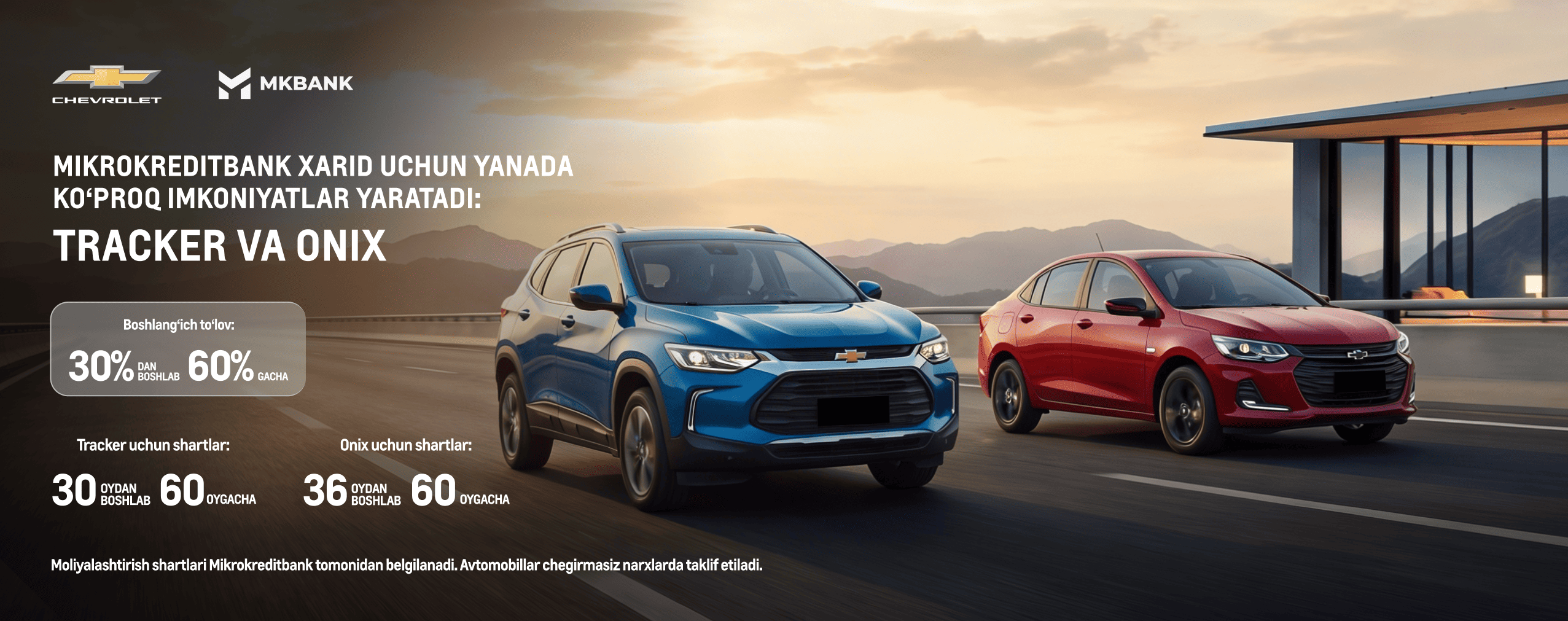 “UzAuto Motors” AJ va “Mikrokreditbank” ATB hamkorligining yangilangan shartlari bilan Chevrolet Onix hamda Tracker avtomobillarini yillik 0% stavka asosida, 60 oygacha muddatli toʻlov sharti bilan xarid qilishingiz mumkin.