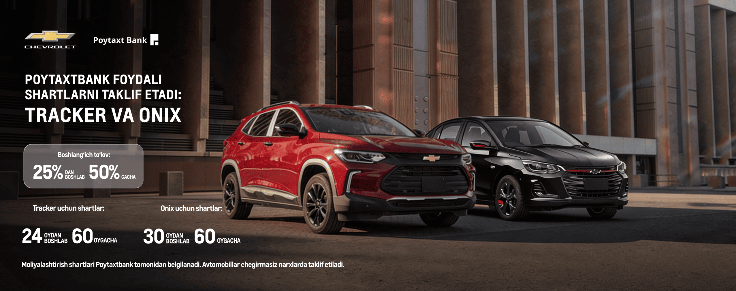 “UzAuto Motors” AJ va “Poytaxt Bank” AJ hamkorligining yangilangan shartlari bilan Chevrolet Onix va Tracker avtomobili xaridi yanada oson. 0% stavkasi bilan muddatli to‘lov sharti asosida foydali xaridni amalga oshiring!