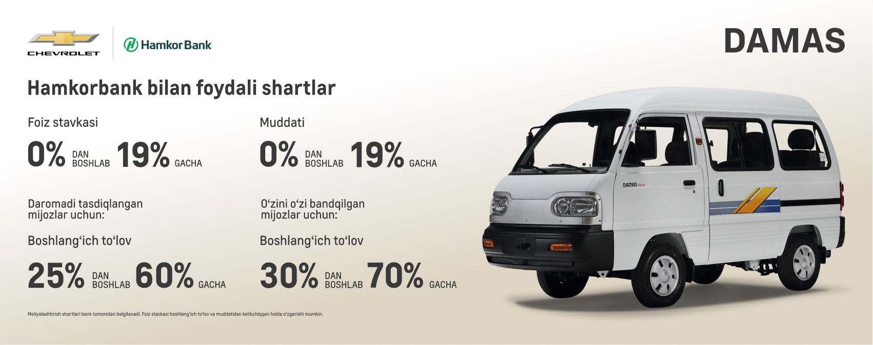 UzAuto Motors” AJ va “Hamkorbank” ATB hamkorligida ishlab chiqilgan maxsus qulay dastur orqali Damas avtomobilini foydali shartlarda xarid qilish imkoniyati mavjud.