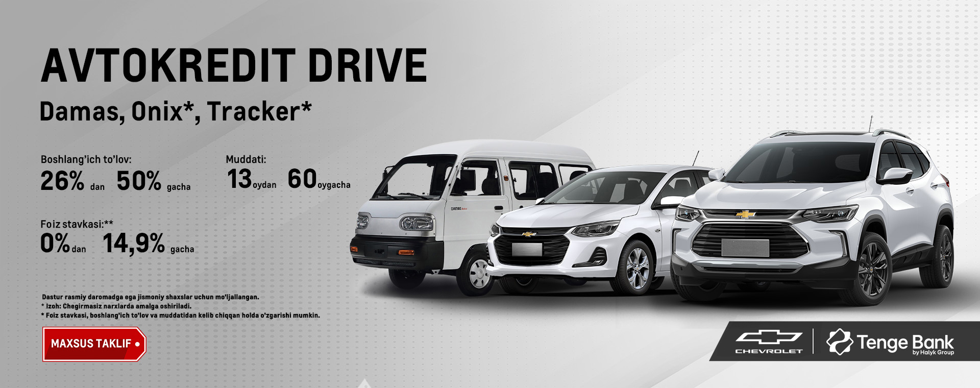 “UzAuto Motors” AJ Tenge Bank hamkorligida jismoniy shaxslar va o‘zini o‘zi band qilgan fuqarolar uchun Damas, Chevrolet Onix* va Tracker* avtomobillarini xarid qilishda qulay avtokredit dasturlari ishga tushirildi.