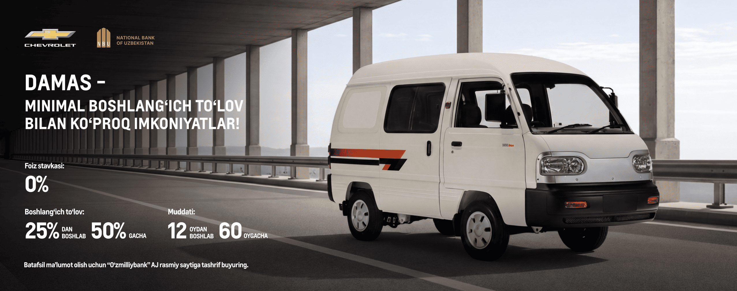 Воспользуйтесь новыми возможностями! АО «UzAuto Motors» совместно с АО «Узнацбанк» предоставляет возможность приобрести автомобиль с минимальным первоначальным взносом и ставкой от 0 %.