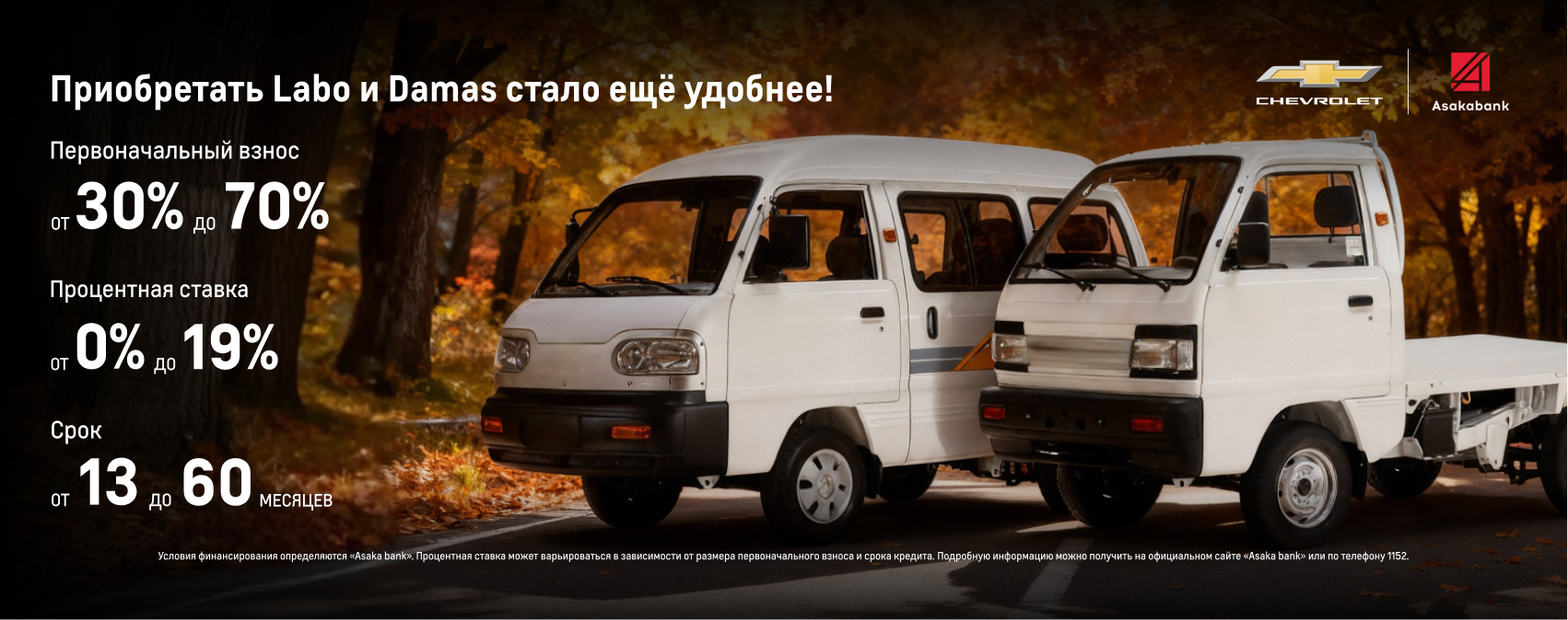 АО «UzAuto Motors» совместно с АТБ «Asaka bank» представляет новую программу, которая позволяет клиентам приобрести автомобили Labo и Damas на привлекательных условиях финансирования.