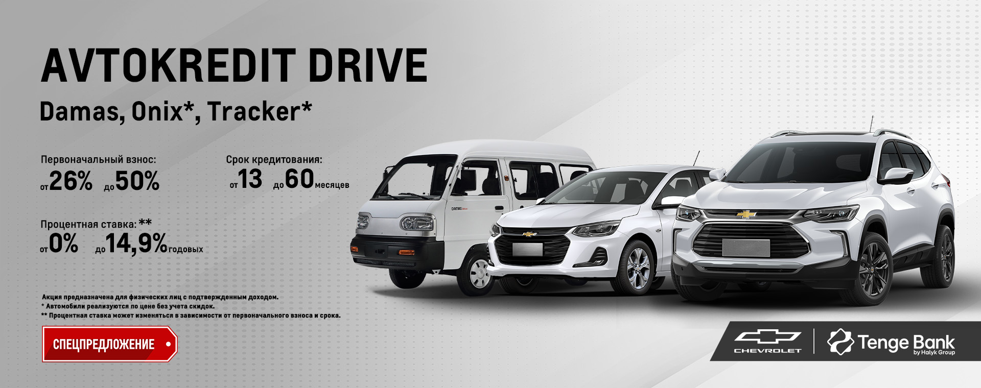 АО «UzAuto Motors» совместно с Tenge Bank запускает удобные программы автокредитования для физических лиц и самозанятых граждан при покупке автомобилей Damas, Chevrolet Onix* и Tracker*.