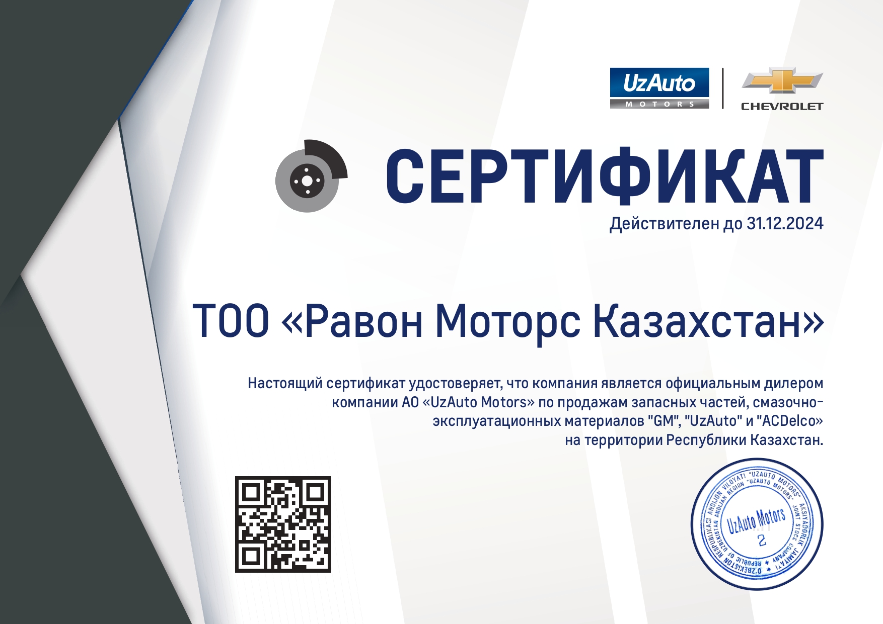 Ushbu sertifikat - kompaniya UzAuto Motors AJ ning Qozog'iston Respublikasi hududida “GM”, “UzAuto” va “ACDelco” ehtiyot qismlari, moylash materiallari va ekspluatatsiya materiallarini sotish bo‘yicha rasmiy dileri ekanligini tasdiqlaydi.