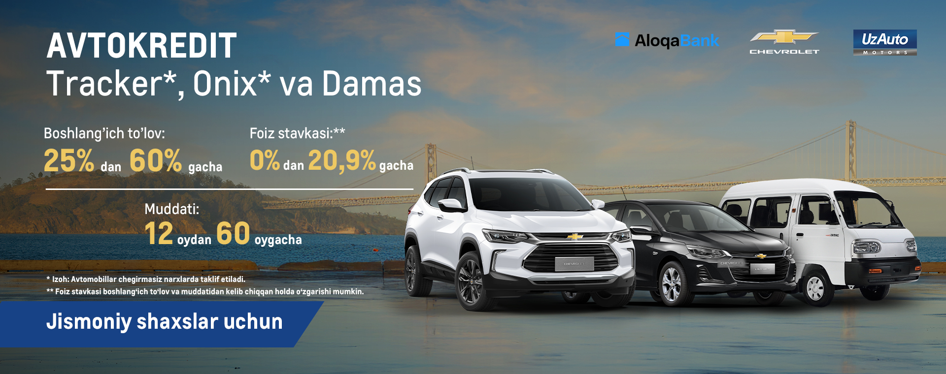 Aloqabank jismoniy shaxslar uchun Chevrolet Onix*, Tracker* va Damas avtomobillari uchun qulay shartlarda avtokredit taklif qiladi!
