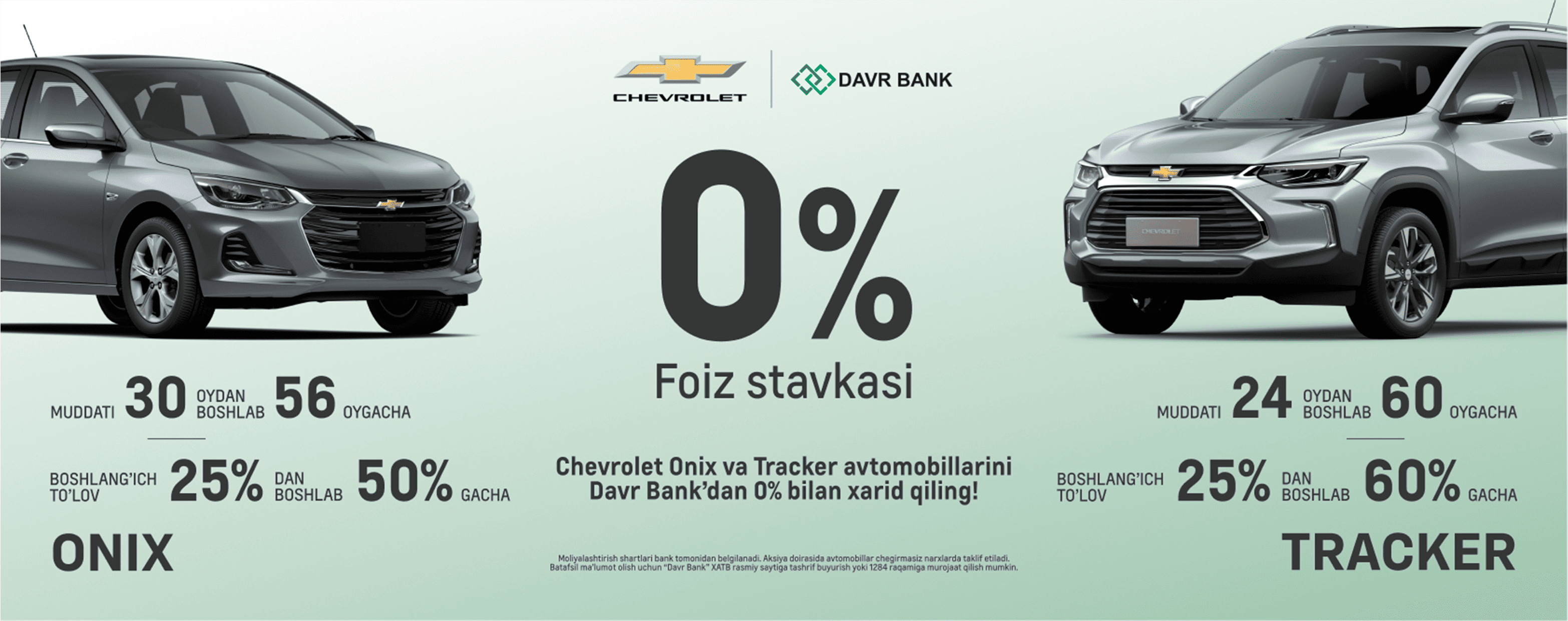 Davr Bank mijozlar uchun Chevrolet Onix va Tracker avtomobillarini qulay shartlarda foizsiz (0%) xarid dasturini ishga tushirdi.
