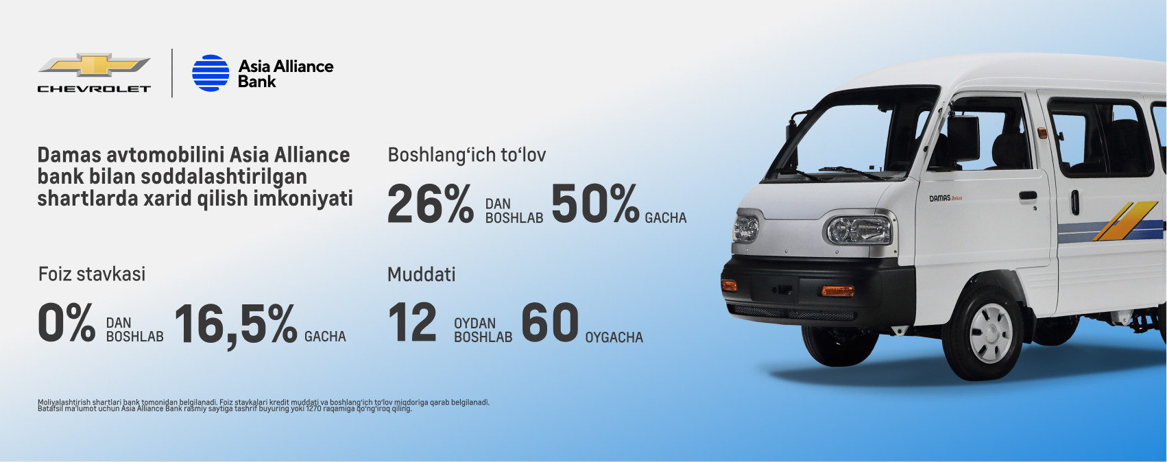 Murakkab jarayonsiz, foydali va qulay to‘lov bilan Damas avtomobili egasi boʻlish uchun bugunoq qadam tashlang!
