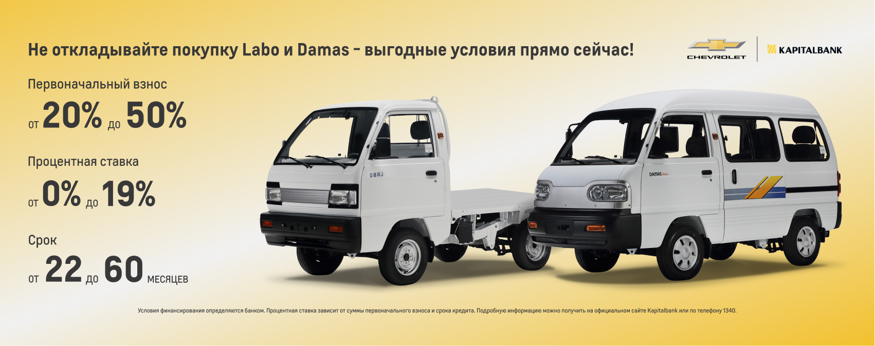 АО “UzAuto Motors” совместно с АТБ “Kapitalbank” предлагает автомобили Labo и Damas на выгодных и гибких условиях оплаты.